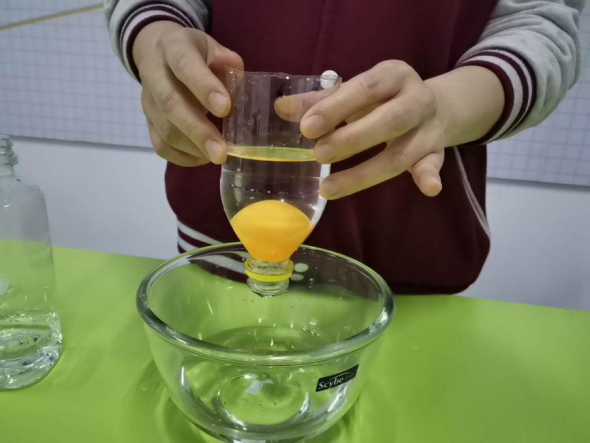 1、在大杯子中倒入一些水,将乒乓球放入裁剪好的水瓶中。