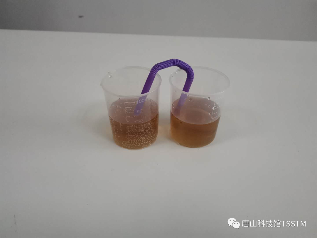 4、将U型的吸管倒置过来,经过一段时间后,吸管就会自动将可乐平分好了!